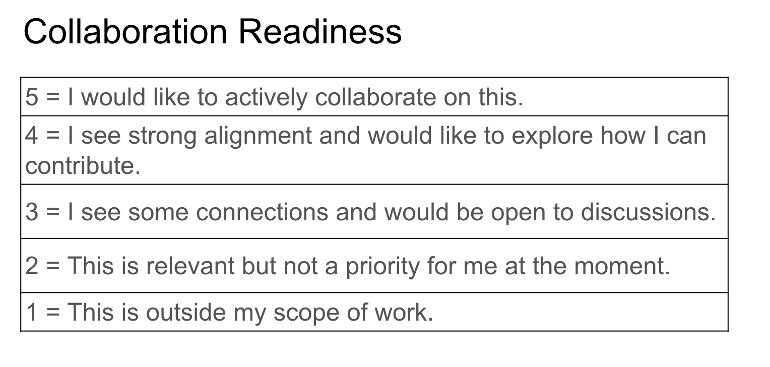 All ideas were then shared in groups and rated by peers, based on their own interest to collaborate. The goal wasn’t to pick “the best idea,” but to surface ideas that resonated widely. This step turned participants into active evaluators and co-owners of the process. It also made visible which ideas felt relevant across diverse contexts and experiences.
